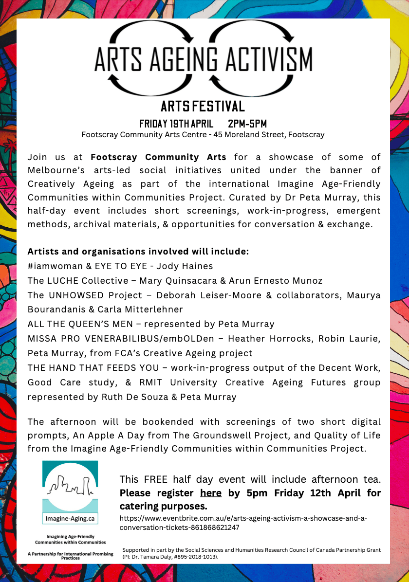 Check out our most recent digital cue: Arts, Ageing and Activism! This digital cue is based on work from a showcase of some of Melbourne’s arts-led social initiatives united under the banner of Creatively Ageing as part of the international Imagine Age-Friendly Communities within Communities Project. Curated by Dr. Peta Murray, the digital cue follows this half-day event and includes short screenings, work-in-progress, emergent methods, archival materials, & opportunities for conversation & exchange.